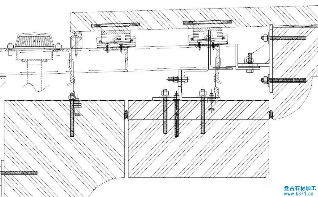 2、吊顶石材的处理在一些入口、檐口等位置,涉及到外立面石材与吊顶交接的收口面,往往为了考虑其美观而选用与外立面材料相一致的石材作为吊顶材料,这些部位同样不适合用普通的挂接方式来处理,某工程运用条件来连接吊顶板,最终导致大量吊顶石材的脱落。建议采用背栓系统,必要的话可在石材中部加打一个背栓,然后以钢丝绳连接到龙骨上,一旦石材脱落,钢丝绳可起到缓冲作用,另外在石材背部衬玻璃纤维网,并以环氧树脂胶粘接也能有效防止碎石板的坠落。